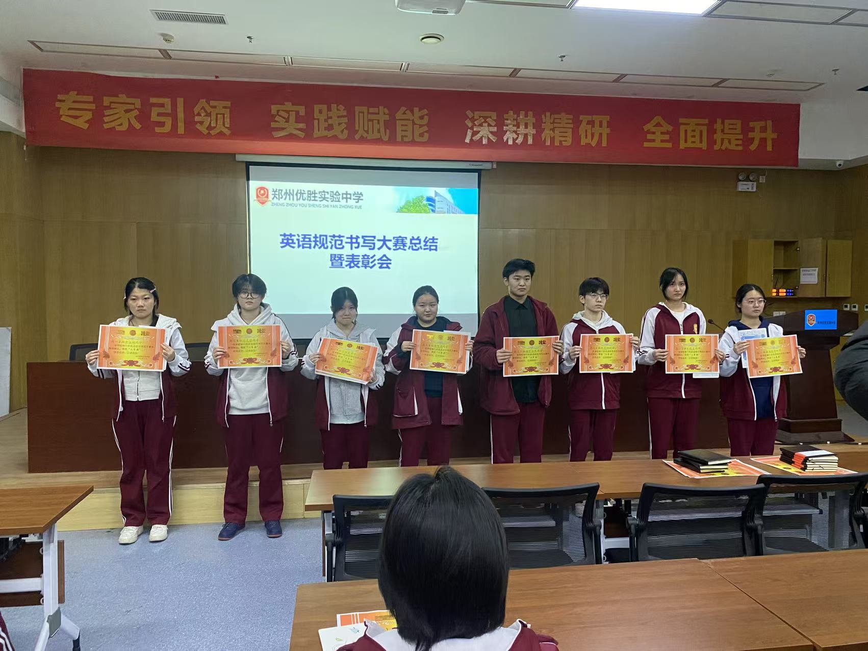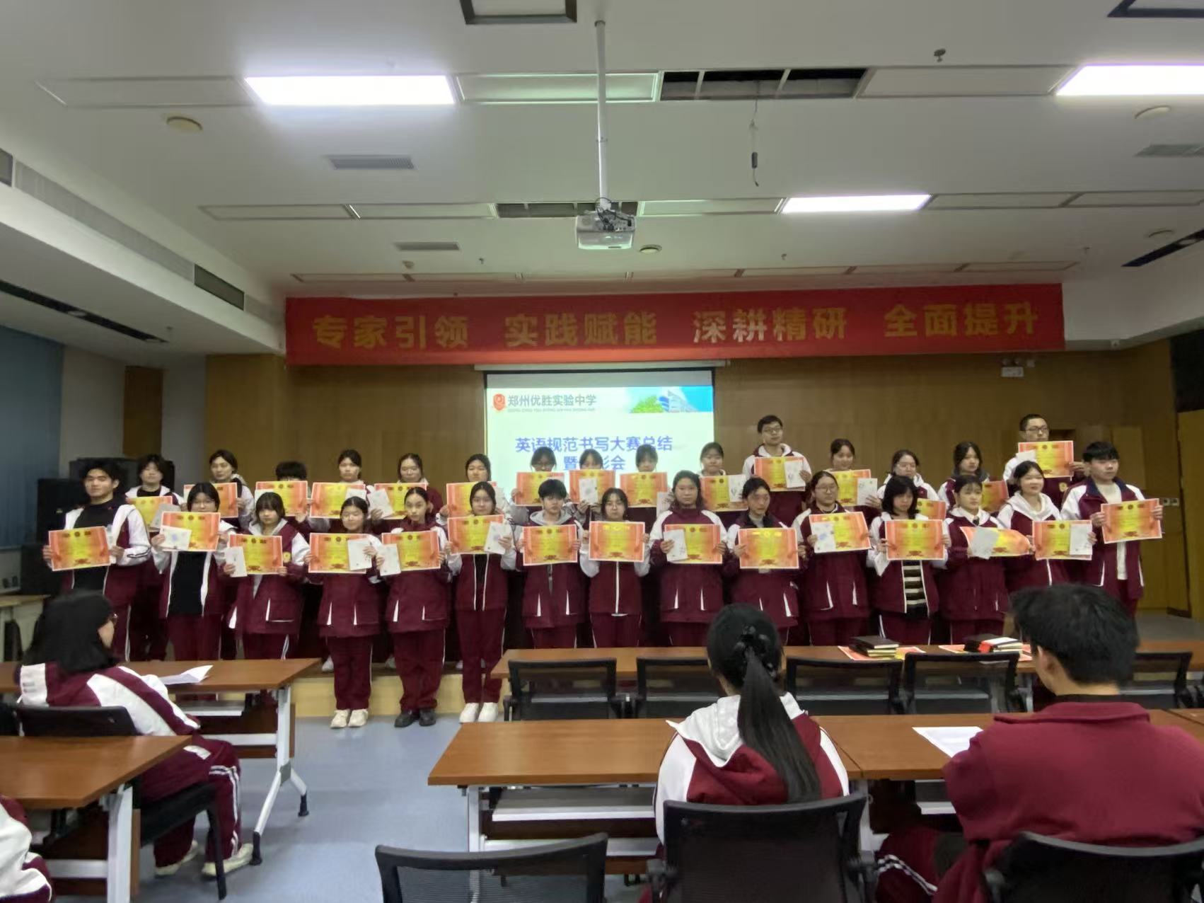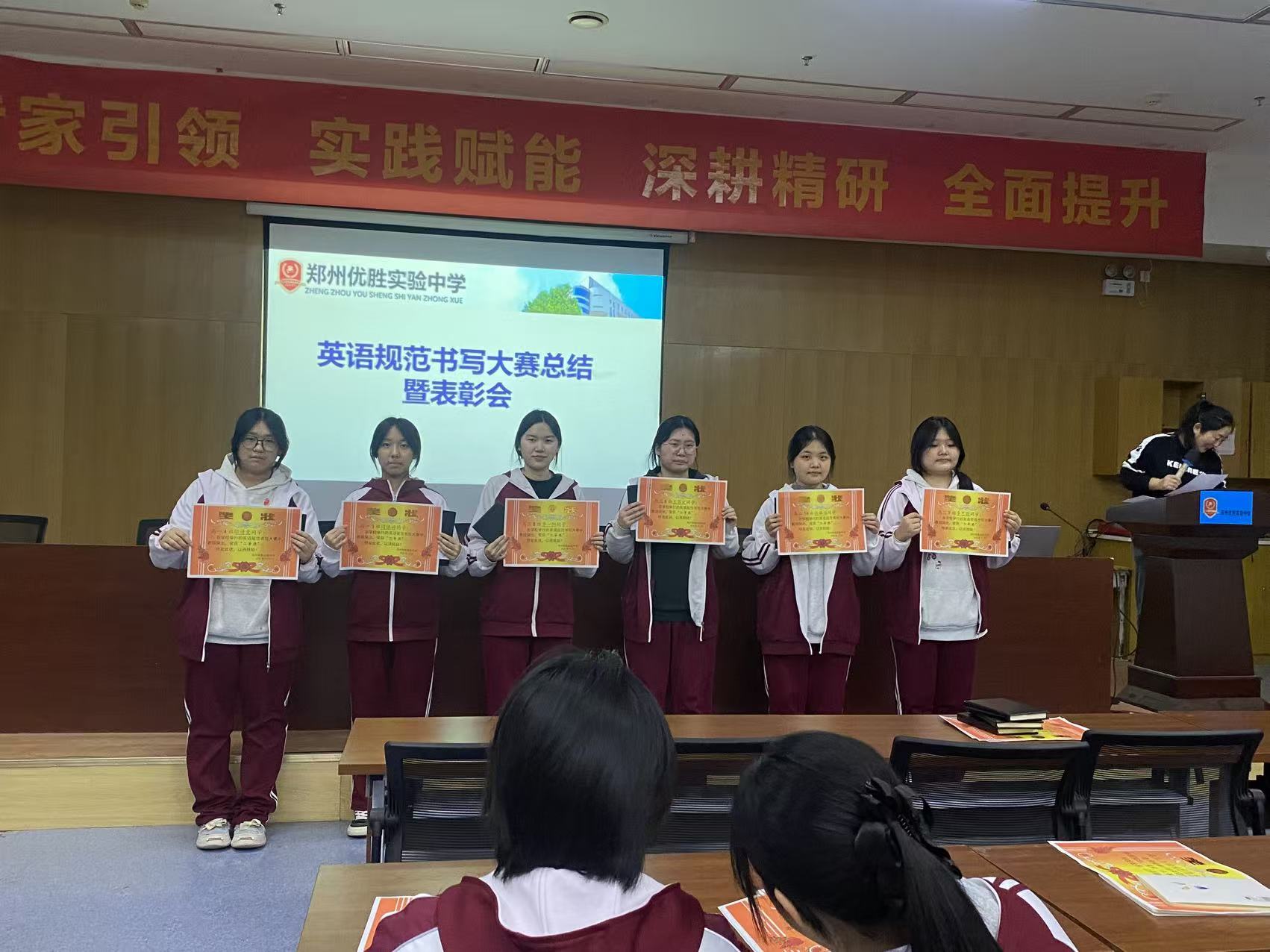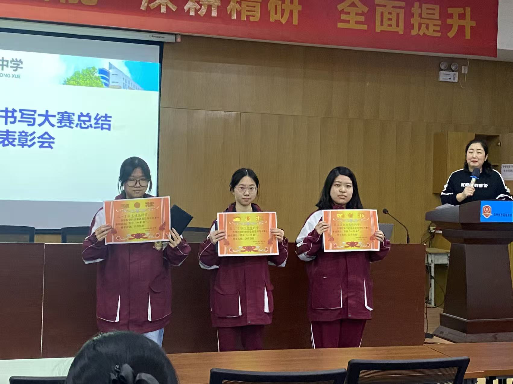 颁奖典礼由高一英语备课组长王鑫鑫老师主持。在轻快的音乐声中,颁奖环节正式启动。校领导与英语教研组教师依次为各年级一、二、三等奖及优秀奖获得者颁发荣誉证书与奖品。获奖学生精神抖擞地走上领奖台,双手接过满载肯定的奖状与精美笔记本,台下掌声如潮。这掌声,既是对他们书写功底的认可,也是对全体同学勤学苦练的激励。