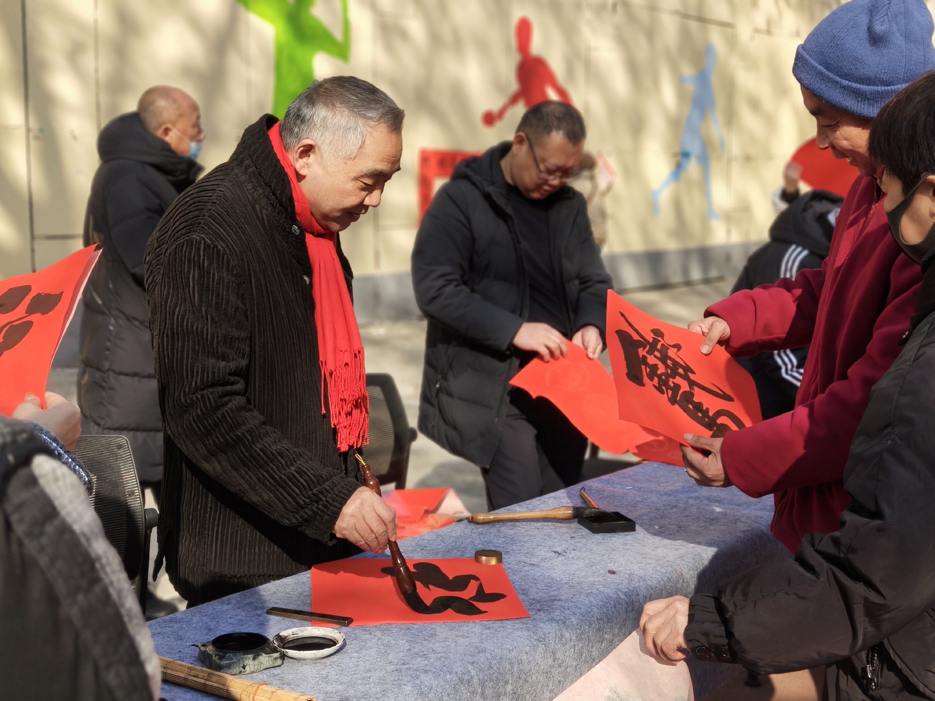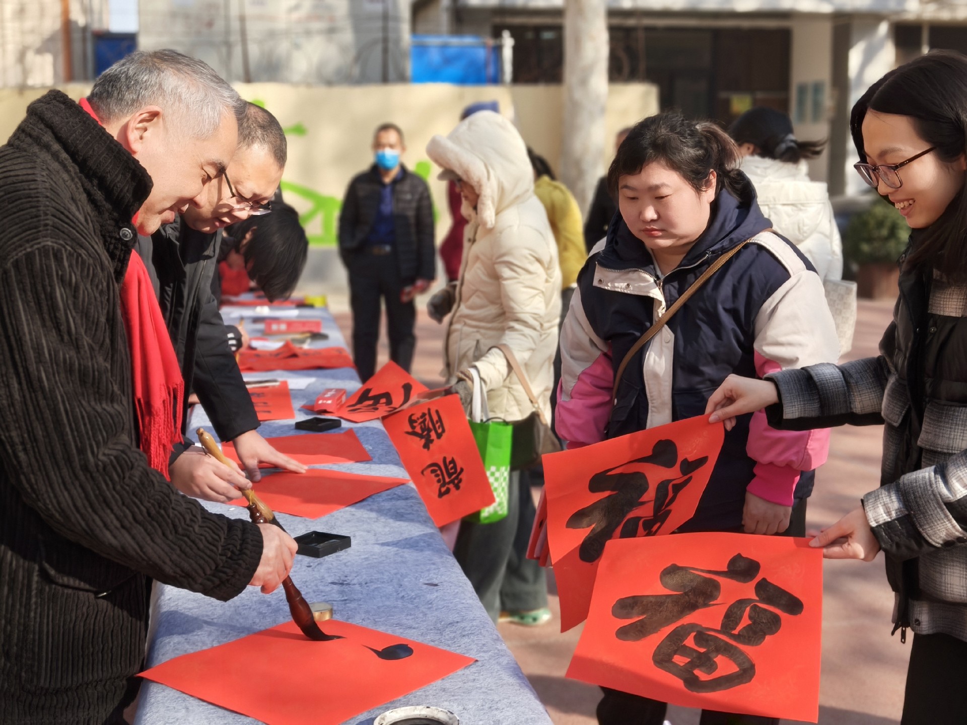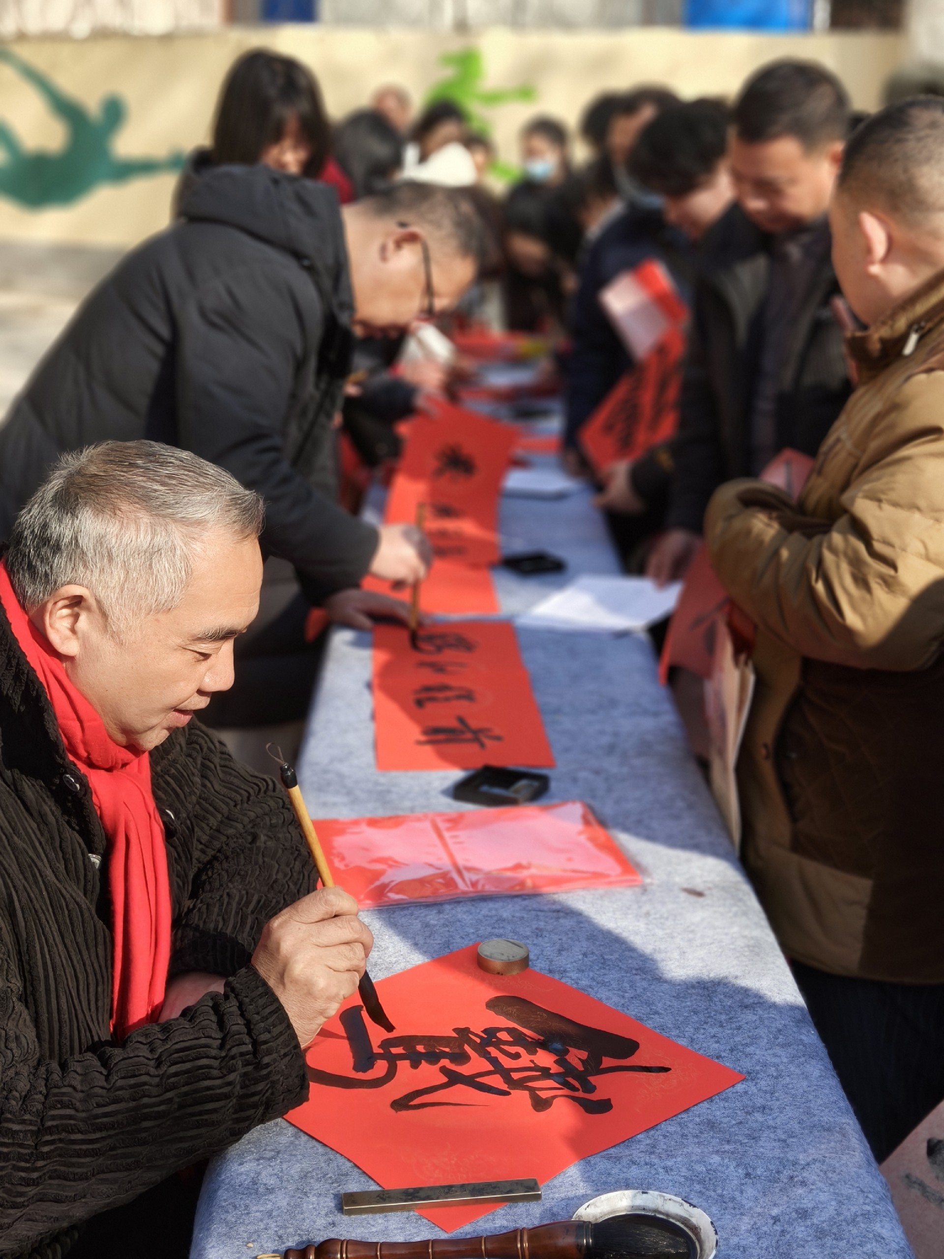 家长会结束后,一场别开生面的“迎春送福”活动在操场热烈展开。学校精心准备了笔墨纸砚,邀请有书法特长的师生、家长现场挥毫泼墨,书写新春对联与福字。红纸铺展,墨香飘溢,一幅幅寓意吉祥、笔力遒劲的春联在笔下诞生。